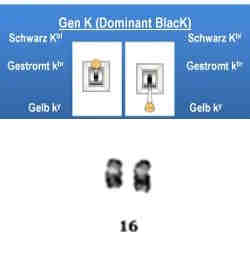 Wie das vonstattengeht, wollen wir mit einem Teil unserer abgebildeten Chromosomenpaare veranschaulichen, denjenigen der Chromosomen16, 5 und 25, die jeweils die Gene K, E und D tragen. Die Schalterstellungen zeigen uns, dass es sich um eine gestromte Doggen mit Maske handelt: