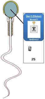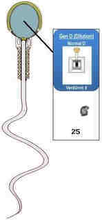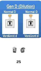 Der Einfachheit halber wollen wir mit dem Chromosomenpaar 25 beginnen, denn dieses trägt auf beiden Chromosomen dasselbe Allel des Gens D, die Dogge ist homozygot für das Gen D: Beide Schalter stehen in der Position „Normal D“, es liegt also kein Allel d für die Verdünnung vor. Demzufolge entstehen bei der Auftrennung der beiden Chromosomen dieses Paares im Rahmen der Meiose ausschließlich Keimzellen, deren Chromosom 25 das Allel „Normal D“ tragen: