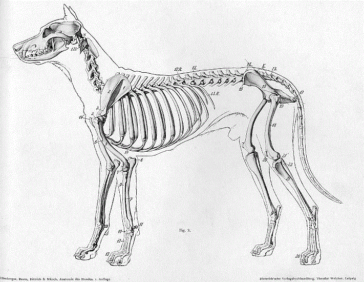 | Anatomie - das Skelett des Hundes (zum Vergrößern auf das Bild klicken!). |