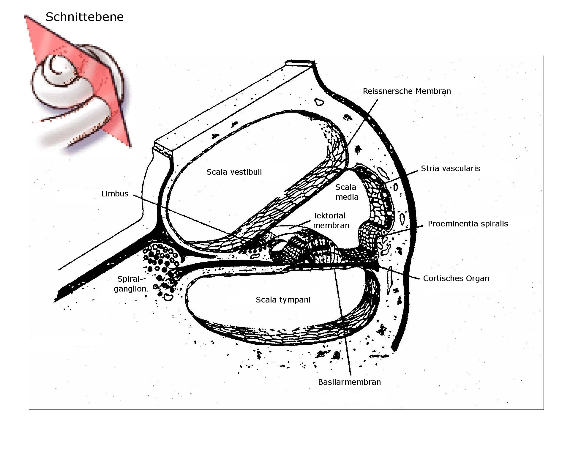 Das Ohr besteht aus drei anatomischen Einheiten: Außenohr, (Ohrmuschel und Gehörgang), Mittelohr (Trommelfell, Gehörknöchelchen und Eustachische Röhre) und Innenohr (Schnecke und Bogengänge). Beim Hörvorgang gelangen Schallwellen über den Gehörgang an das Trommelfell und versetzen dieses in Schwingung. Diese Vibrationen werden über die drei gelenkig verbundenen Gehörknöchelchen Hammer, Amboss und Steigbügel (so benannt aufgrund ihrer prägnanten Formen) an die Schnecke übertragen: Der Fuß des Steigbügels ist über eine Öffnung beweglich mit den drei flüssigkeitsgefüllten Kammern im Inneren der Schnecke verbunden: Der durch die Schallwellen in Vibration versetzte Steigbügel kann so die Schwingungen an die Flüssigkeit in den Kammern übertragen und diese in eine Wellenbewegung versetzen. Diese Übertragung der Schallwellen vom äußeren Ohr bis zur Schnecke des Innenohres funktioniert auch bei pigmentmangelbedingter Taubheit. Der degenerative Vorgang, der zum Verlust des Hörvermögens führt, tritt in der Schnecke selber auf. |