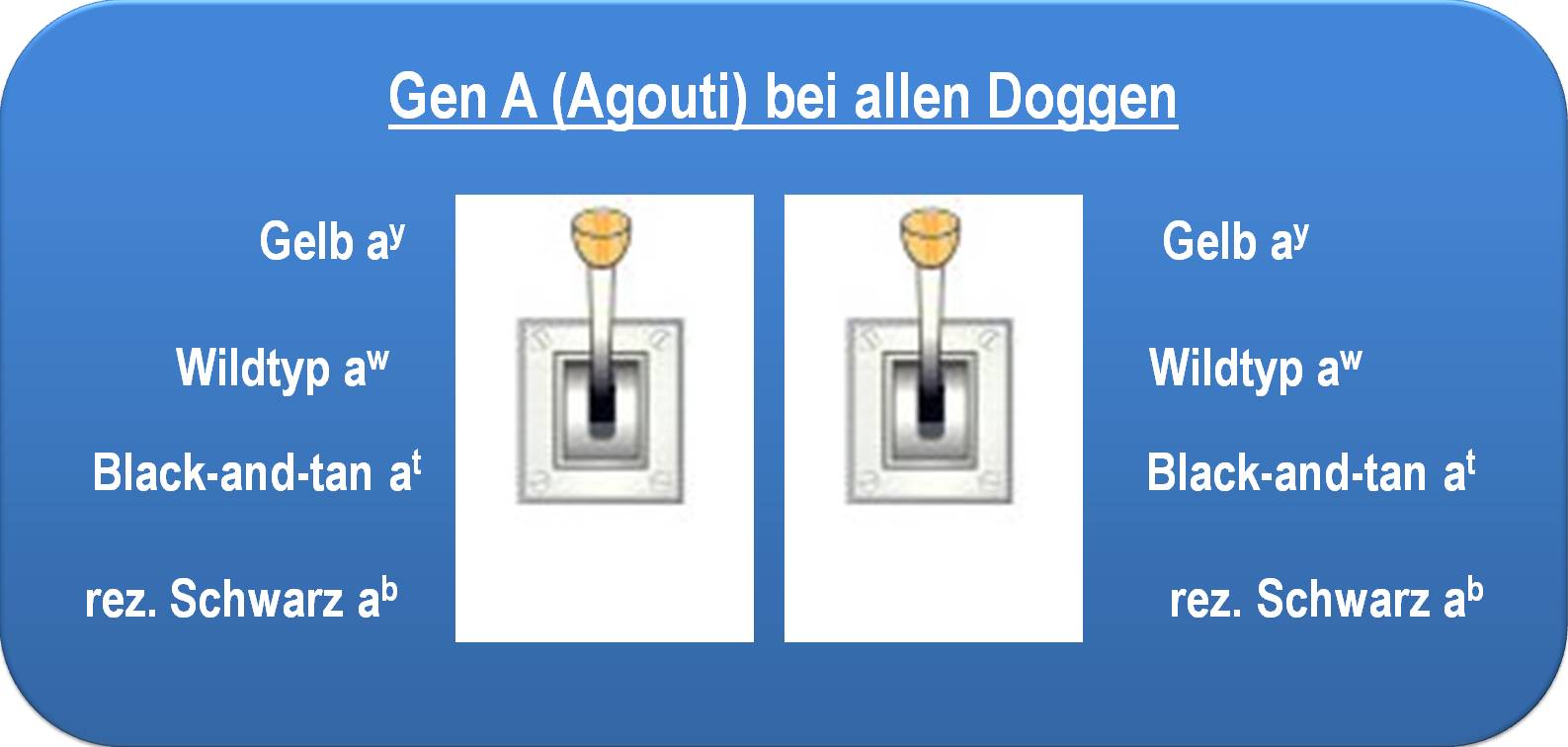Bis jetzt war alles ein Wiederholung von Teil 1…nun wird es Zeit, endlich etwas Neues zu entdecken. Aber bevor wir zur Vererbung der Maske kommen, möchte ich ein kurzes Intermezzo einem der Gene widmen, die bei allen Doggen gleich sind und von daher eigentlich für die verschiedenen Farbschläge keine Rolle spielen: Es handelt sich um das Gen „Agouti“: Dieses besitzt 4 Allele…von denen nur ein einziges bei Doggen vorkommt: