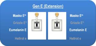 Dem Masken-Gen „Extension“ hat man inzwischen vier Allele zugeordnet, das bislang letzte kam 2010 hinzu…und jetzt die gute Nachricht: Bei der Dogge gibt es nur zwei dieser Allele, und diese haben einen denkbar einfachen Effekt: Trägt der Hund ein oder zwei Allele Em, hat er eine schwarze Maske, besitzt er dagegen zwei Allele E, hat er sie nicht: Das Masken-Allel Em ist dominant über das Allel E: