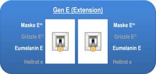 Im gelb/gestromten Farbschlag gibt es somit 4 Farb-Phänotypen: Gelb ohne Maske, Gelb mit Maske, Gestromt ohne Maske sowie Gestromt mit Maske. Wie wir bereits erwähnten, kann jeder durch ein dominantes Allel bedingte Phänotyp als versteckter Träger ein rezessives Allel aufweisen: Uranus trägt in unserem Beispiel versteckt das Allel E, welches homozygot einen Hund ohne Maske wie Guada ergibt. Auf unseren abschließenden Schemata führen wir jeweils gemeinsam alle Genotypen (also Kombinationen von Allelen) auf, die zum selben Phänotyp führen.