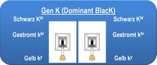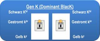 Es bleiben also drei mögliche Genotypen in diesem Farbschlag: Da das Allel für die Stromung kbr dominant über dasjenige für Gelb ky ist, sind sowohl Colleen mit zwei Allelen kbr also auch Adagio mit nur einem Allel kbr gestromt: Colleen ist also homozygot für kbr und Adagio heterozygot, und aufgrund der Dominanz von kbr über ky sind beide gestromt. Nur bei zwei Allelen für Gelb ky ist der Hund von gelber Farbe, denn das Allel ky ist rezessiv gegen über kbr und muss deswegen homozygot vorliegen, um sich ausprägen zu können: