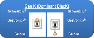 Bei der ersten Betrachtung des gelb/gestromten Farbschlags treffen wir zu Beginn auf einen alten Bekannten aus Teil 1: Das Gen „Dominant Black“, das uns dazu gedient hatte, ein Gen mit drei Allelen darzustellen, die Allele für Schwarz (Kbl), Gestromt (kbr) und Gelb (ky). Wir hatten dort auch festgestellt, dass Kbl dominant über kbr und ky ist, also jeder Hund, der ein Allel Kbl trägt, zwangsläufig schwarz ist. Im gelb/gestromten Farbschlag kommen also die drei Schalterpositionen des Gens „Dominant Black“ nicht vor, bei denen einer oder beide Schalter auf „Schwarz Kbl“ stehen, so wie das bei Emmi, Etzel und Dipta, den drei Schwarzen aus Teil 1, der Fall ist.