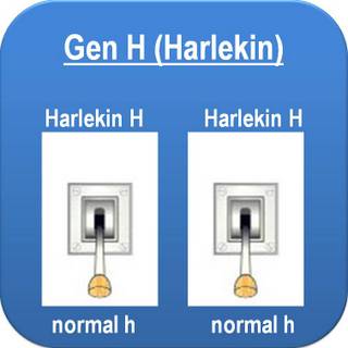 Aus den genannten Gründen der epistatischen Verbindung zwischen den Genen „Merle“ und „Harlekin“ macht es keinen Sinn, ein Schalterschema für das „Harlekin“-Gen allein darzustellen: Ein Hund, der ein „Harlekin“-Allel trägt ist in Abhängigkeit der Allele des „Merle“-Gens Schwarz, Gefleckt oder Doppel-Merle…