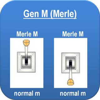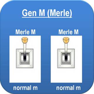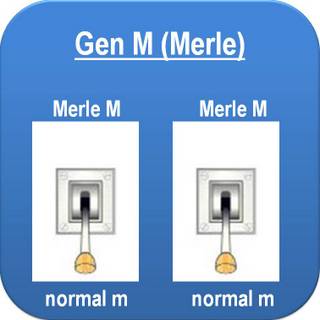 Je nachdem, ob keine, eine oder beide Genkopien das Allel M „Merle“ tragen, sieht also der Phänotyp unterschiedlich aus: Je mehr „Merle“-Allele, desto stärker die Pigmentverdünnung. Zur Erinnerung hier noch einmal das Schema der drei verschiedene Phänotypen der drei Genotypen des „Merle“-Gens: